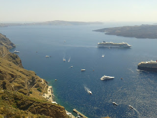Happily, we didn't have to wait too long, and we made it to Oia in time for some shopping, plenty of white and blue architecture spotting, and a very lovely Greek dinner. Though we had abandoned the hike, we were all pretty knackered via walking and the sun, so a lovely birthday dinner for our friend was the true highlight of the day. Well, that and the incredible views we saw throughout, not least of which was the panorama presented by our seats at the restaurant. After filling our bellies with wine and lamb and fish and the like, we made our way back to yet another taxi stand where as fate would have it, the very same driver who brought us to Oia squired us back to Fira and another long line for the cable car. While going down was probably a slight bit more terrifying than going up, the tender back to the ship was much calmer and more serene, particularly with an amazing sunset glimmering from over the mountain peaks.